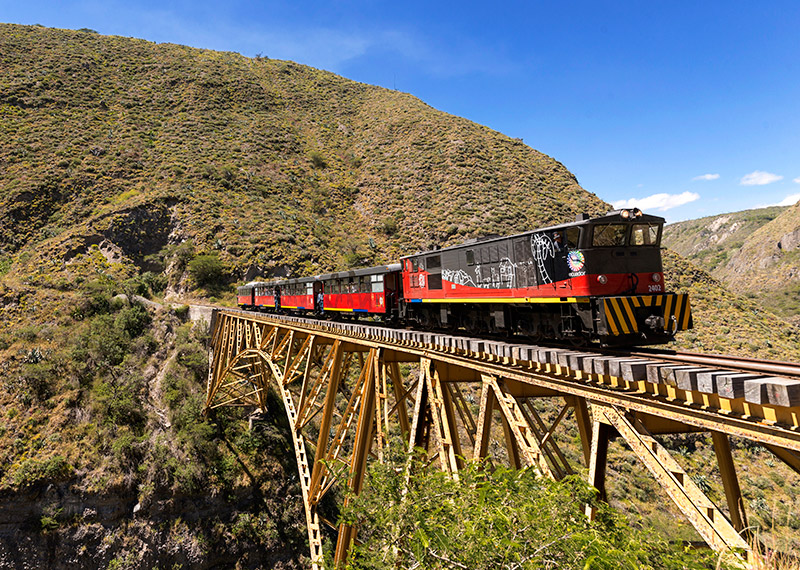 La aventura inicia en la estación de Chimbacalle, de donde partimos hacia la “Avenida de los Volcanes”. Pichincha, Atacazo, Pasochoa, la Viudita, Rumiñahui acompañan al tren en su ruta. La vía desciende por las “selvas de Panzaleo” que prestaron madera para las iglesias de Quito, atravesando pastizales, cultivos y haciendas. En Tambillo y Machachi disfrutamos la gastronomía y cultura de los chagras. En El Boliche, a los pies del Cotopaxi, descubrimos su flora y su fauna y regresamos a Machachi para conocer la Granja La Estación y degustar un almuerzo. La ruta del tren es: Quito, El Boliche, Machachi, Quito Al finalizar la excursión retorno al hotel
